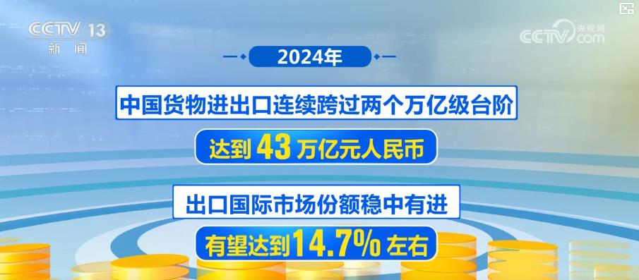 2024年,达到43万亿元人平易近币。出口国际市场份额稳中有进,无望达到14。7%摆布。有进出话柄绩的企业近70万家,此中平易近营企业占比跨越八成。同时,“立异”成为中国外贸的明显底色,通过智能化、数字化、中国产物的立异力获得了全球消费者的青睐。中国新业态的潜力仍正在持续,“鼠标一点,买卖全球”,跨境电商为全球消费者创制了更为便当的购物体验,也支持其持续数年实现两位数增加。